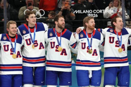 Em uma emocionante cerimônia, a equipe masculina de hóquei dos Estados Unidos celebrou sua conquista da medalha de ouro ao derrotar o Canadá na partida final das Olimpíadas de Inverno de Milano Cortin...
