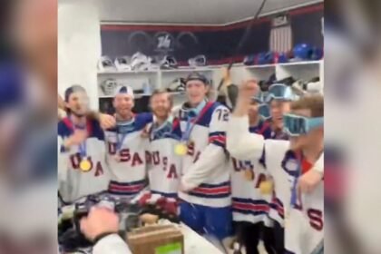 Em uma demonstração épica de orgulho americano, a seleção de hóquei dos Estados Unidos fez uma performance emocionante ao cantar “Courtesy of the Red, White and Blue” de Toby Keith, após u...